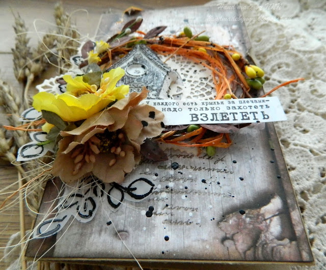 Немного поштампила на фоне, поэмбосила домик и веточки - чудесные штампы Altenew, побрызгала патиной и грунтом.